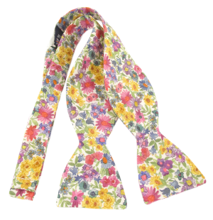 A self tied bow tie made with Liberty fabric. We also have matching pocket squares as well as ties, pre-tied bow ties and cravats. 100% Cotton Bow Height: 5.5cm Neck Size: 37cm – 56cm