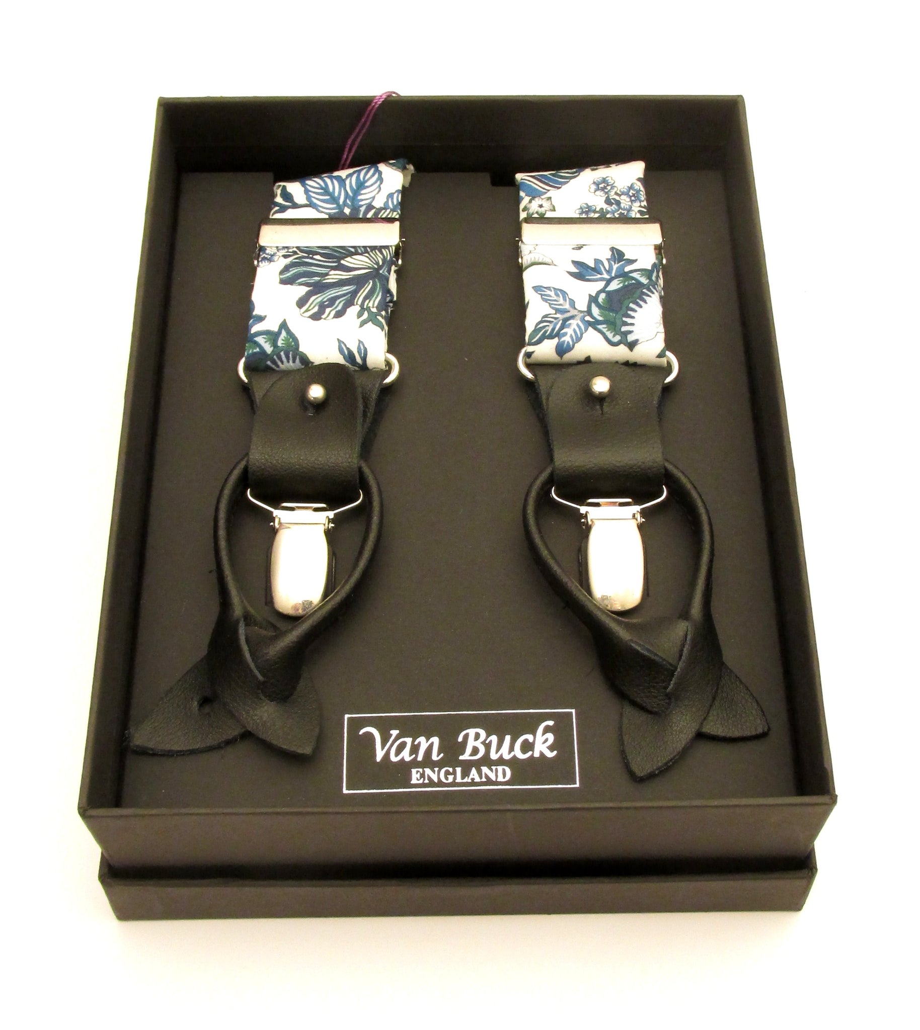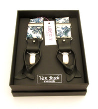 Liberty Trouser Braces. These braces are fully adjustable and elasticated making them a one size fit. They have sturdy and durable silver clips as well as a leather end button fixing.