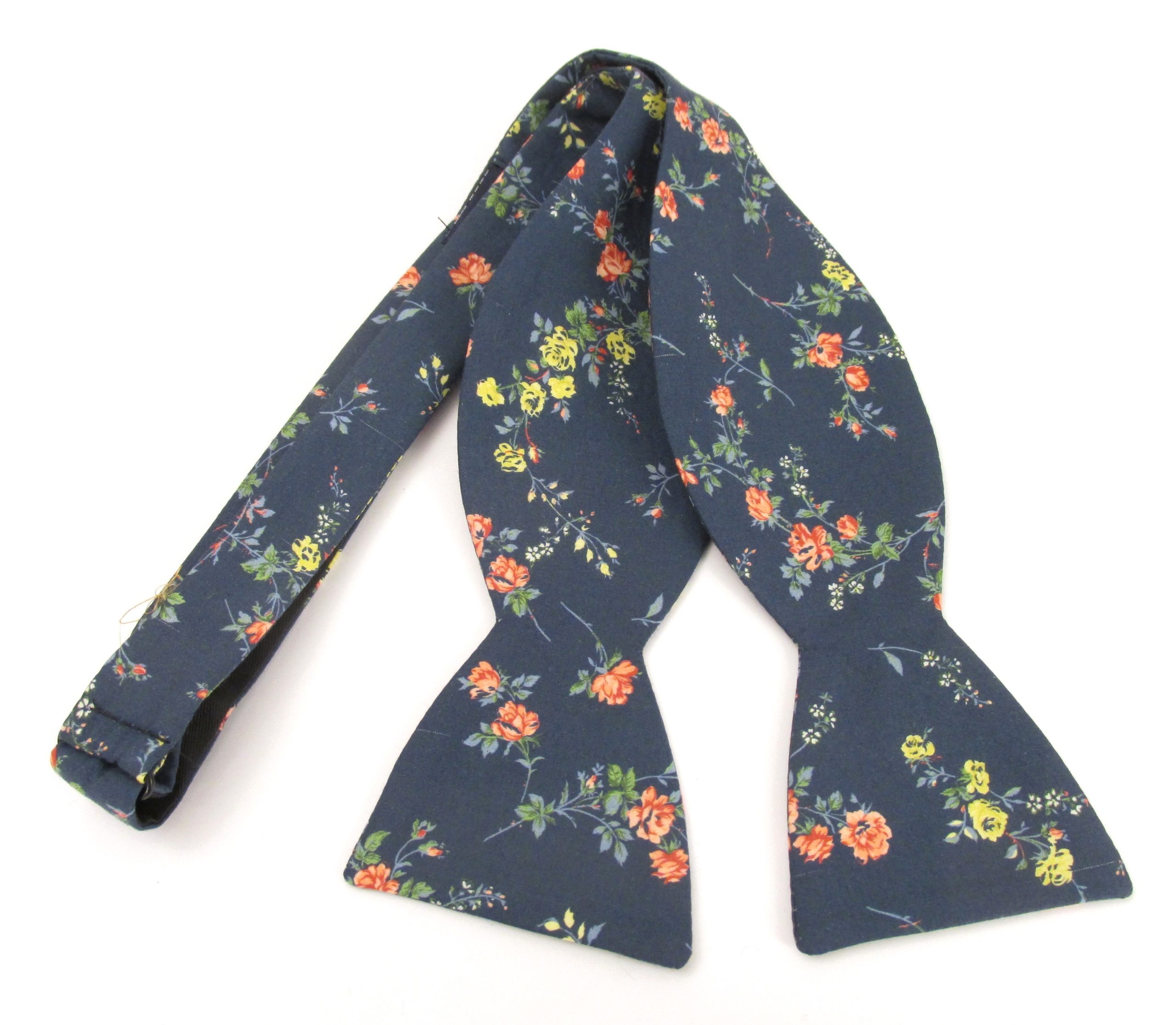 A self tied bow tie made with Liberty fabric. We also have matching pocket squares as well as ties, pre-tied bow ties and cravats.
