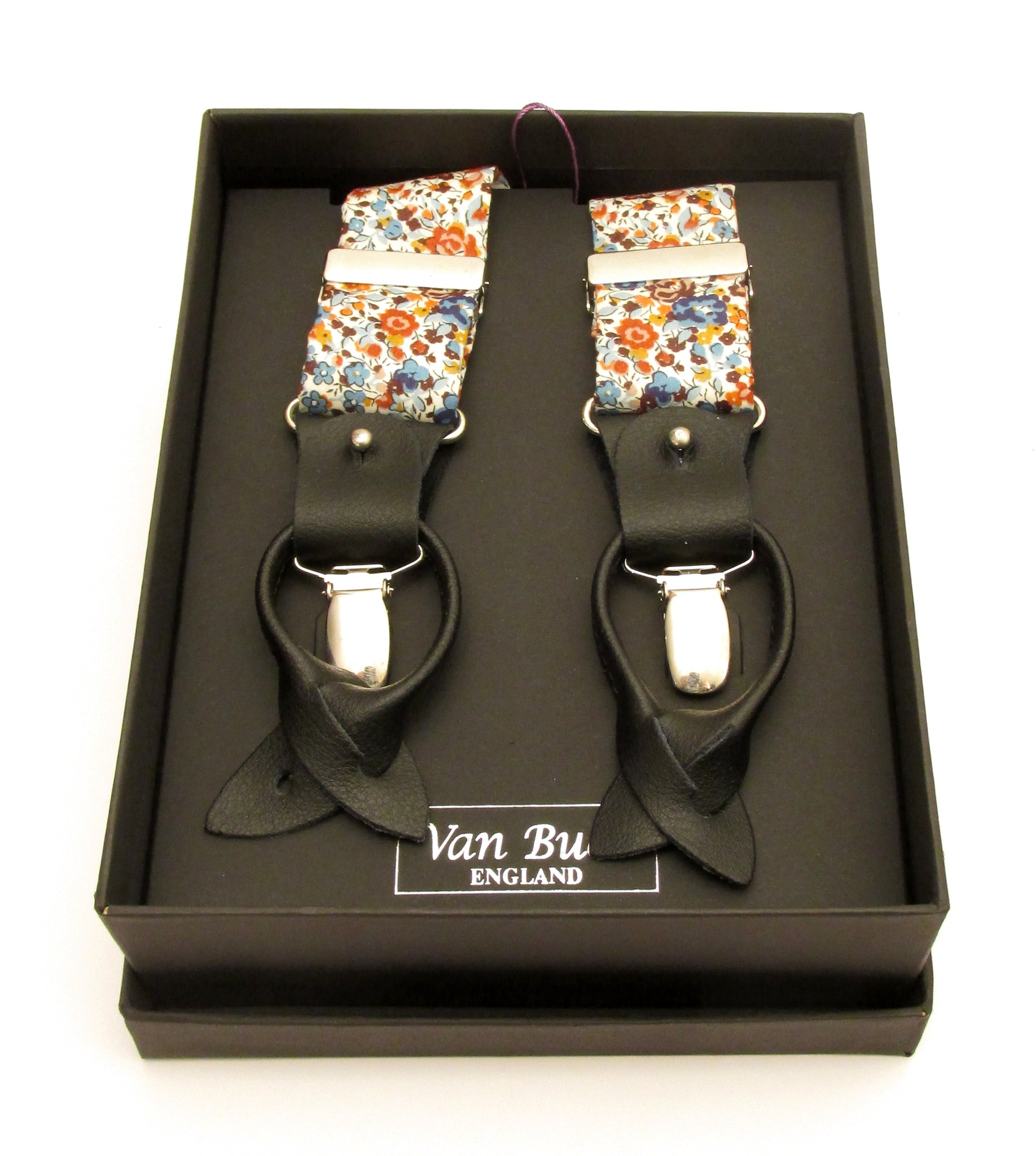 Liberty Trouser Braces. These braces are fully adjustable and elasticated making them a one size fit. They have sturdy and durable silver clips as well as a leather end button fixing.