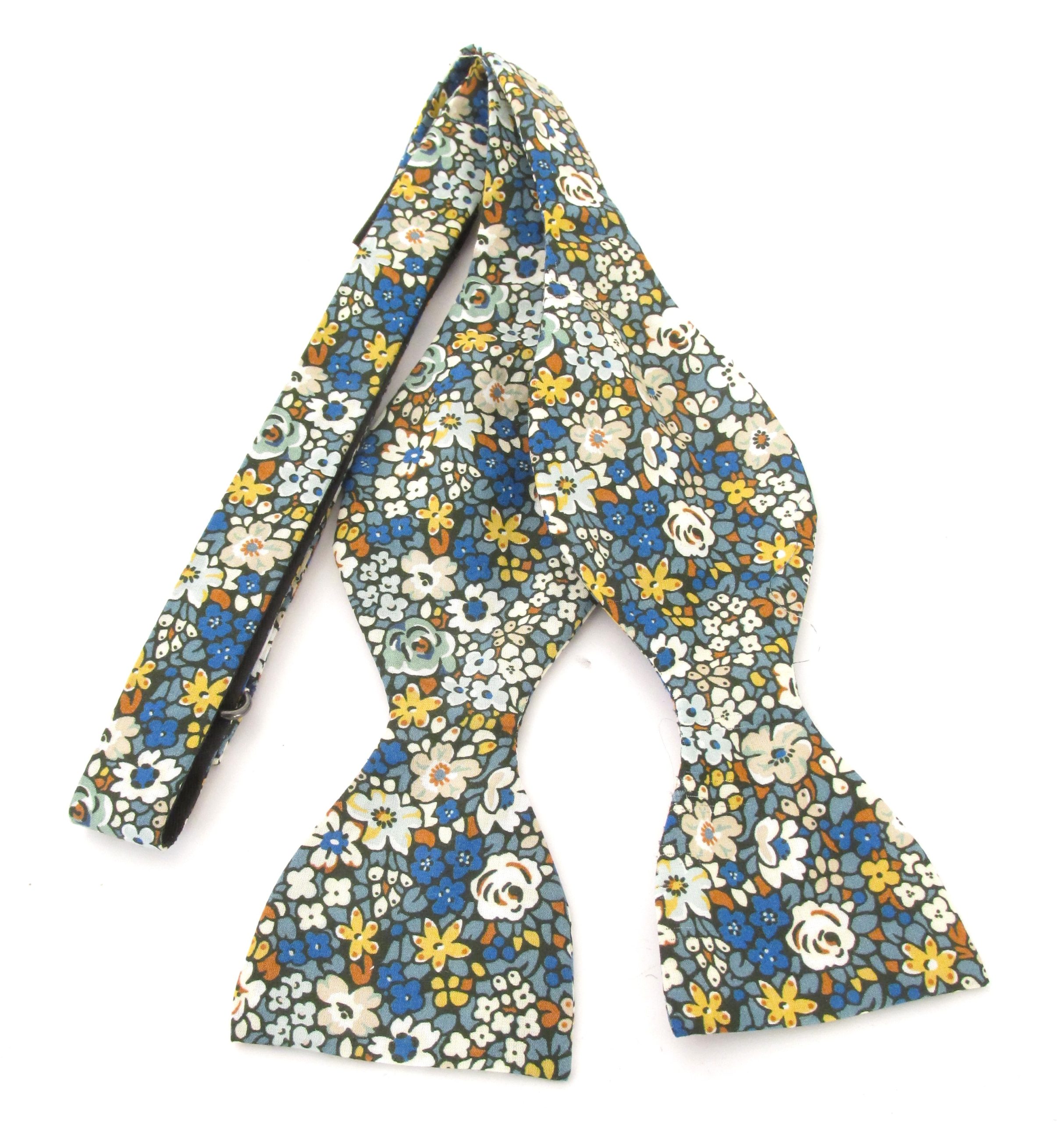 A self tied bow tie made with Liberty fabric. We also have matching pocket squares as well as ties, pre-tied bow ties and cravats.