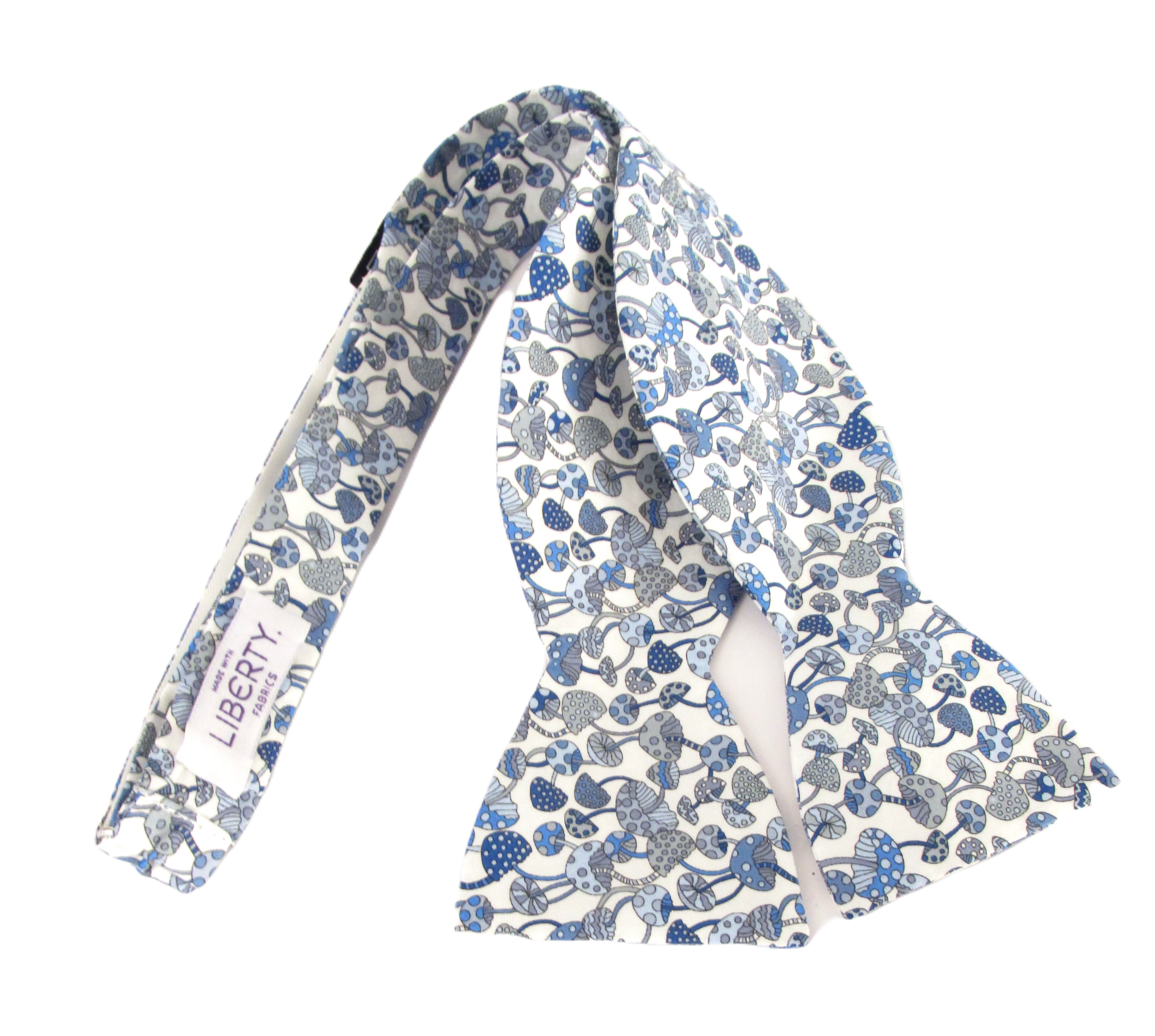 A self tied bow tie made with Liberty fabric. We also have matching pocket squares as well as ties, pre-tied bow ties and cravats.