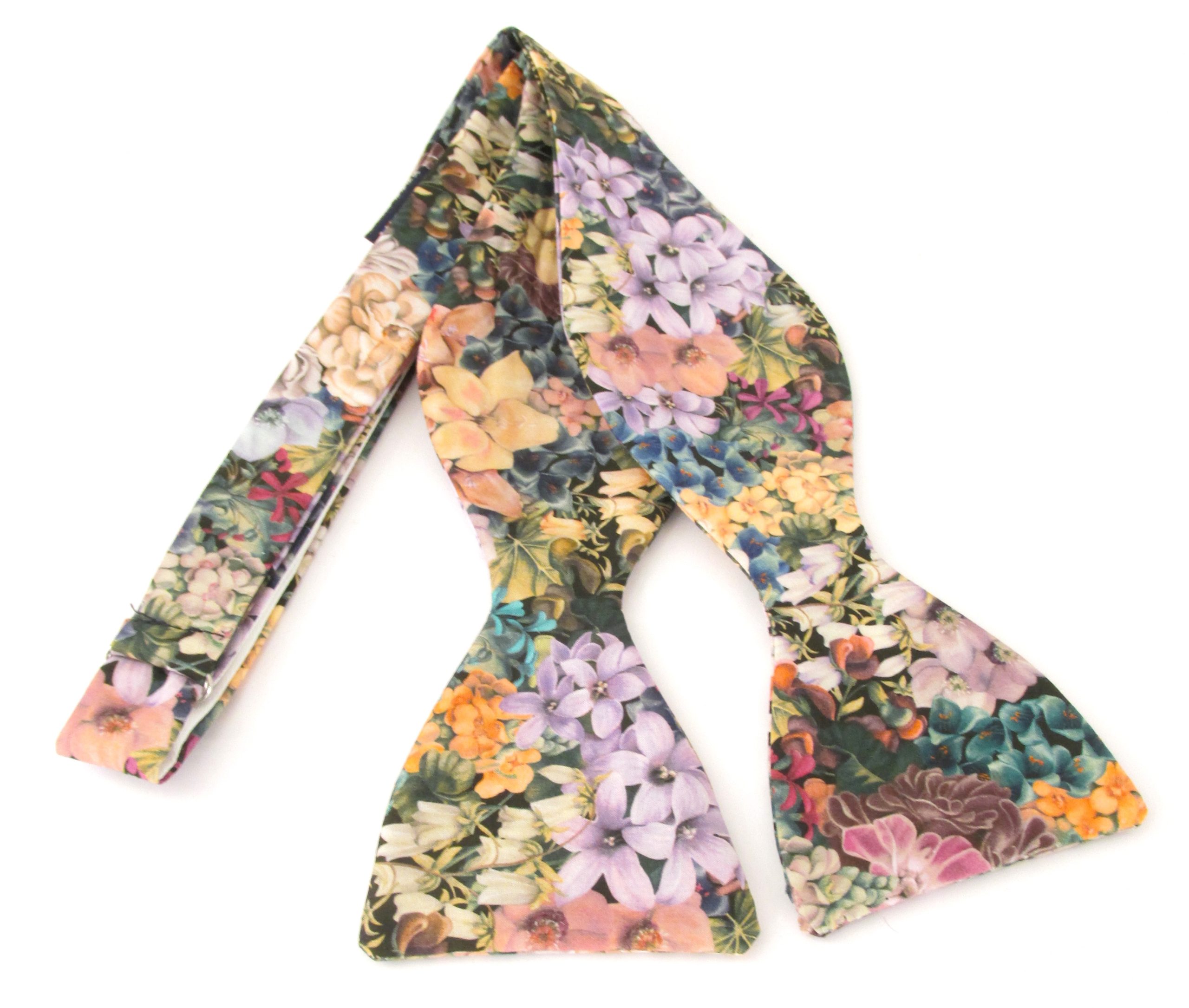 A self tied bow tie made with Liberty fabric. We also have matching pocket squares as well as ties, pre-tied bow ties and cravats.