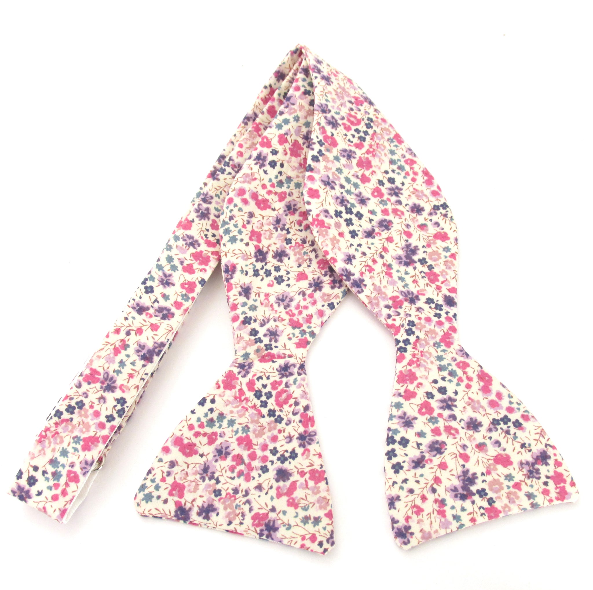 A self tied bow tie made with Liberty fabric. We also have matching pocket squares as well as ties, pre-tied bow ties and cravats.