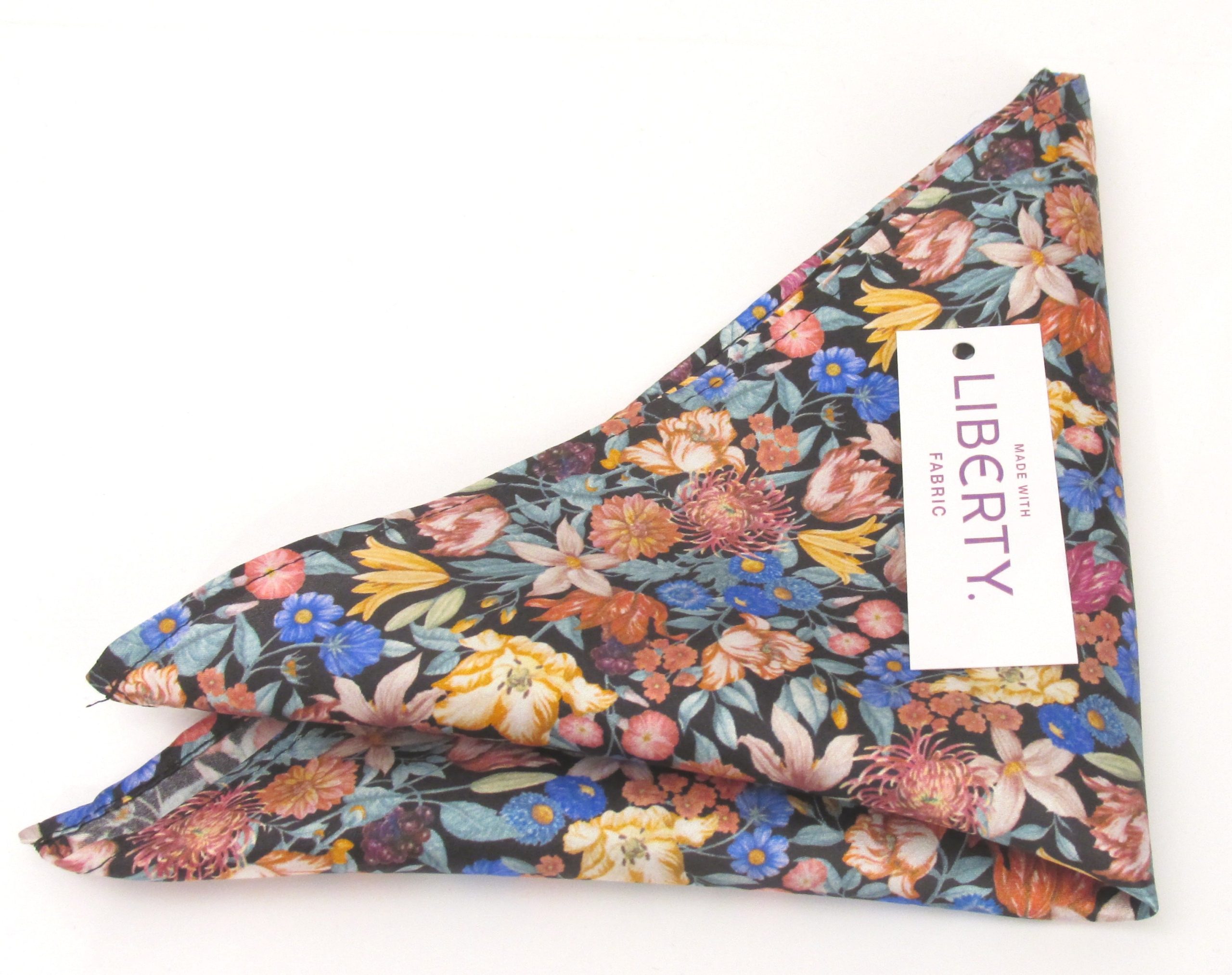 A Van Buck silk pocket square/hank using exclusive Liberty silk printed fabric. These designs are also available in Ready Tied Bows, Self-tie Bows and Ties.