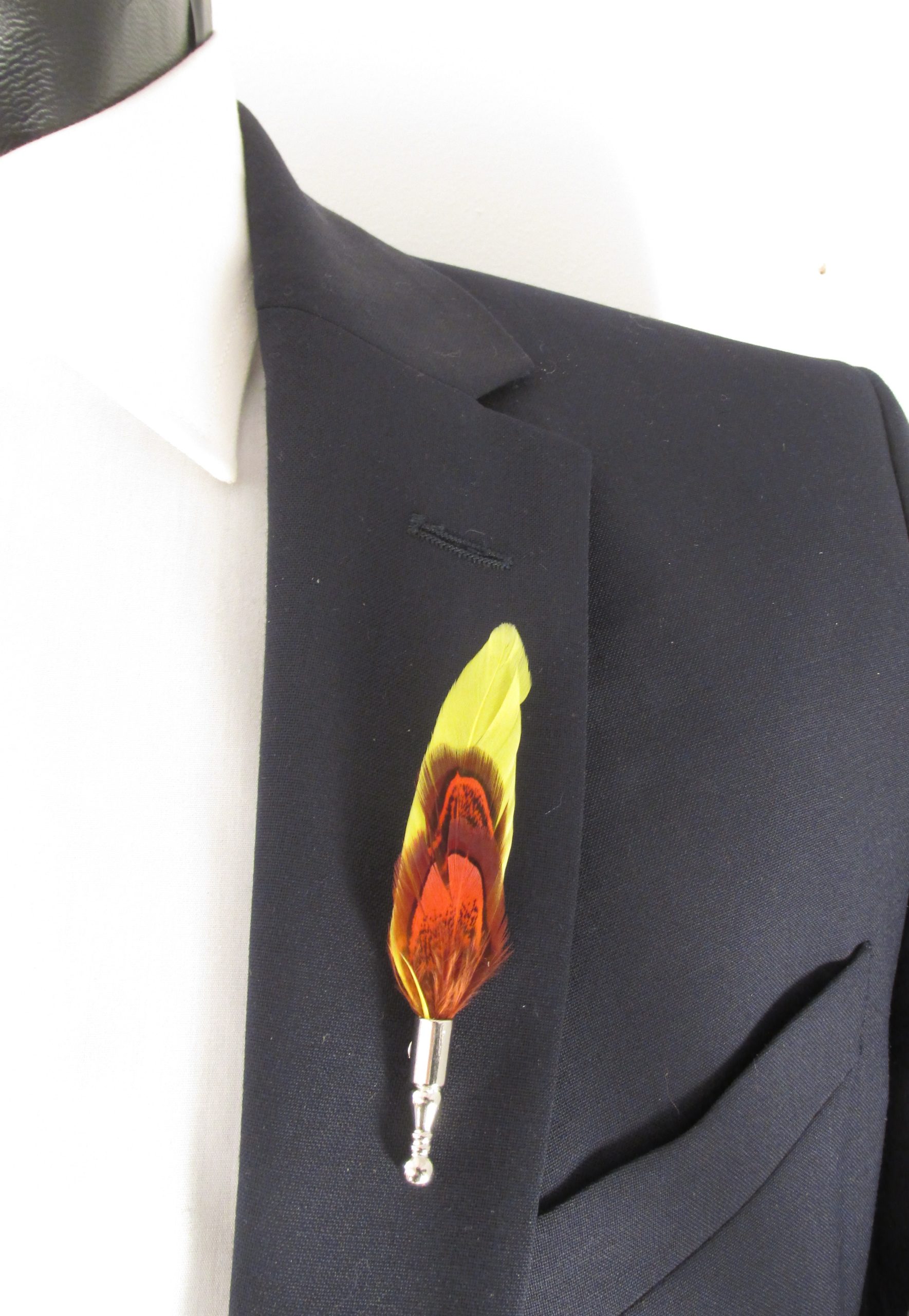 A feather lapel pin / boutonnière to brighten up any jacket.